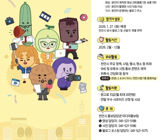 ![]() ![]() [2026³â õ¾È½Ã ¼Ò¼È¹Ìµð¾î ¼Æ÷ÅÍÁî ¸ðÁý È«º¸¹®/»çÁø=õ¾È½Ã Á¦°ø] ¿µ»ó¡¤»çÁø¡¤ºí·Î±× Æ÷½ºÆÃ ºÎ¹® 15¸í ¸ðÁý¡¦ 20ÀϱîÁö ½Åû¹Þ¾Æ ¿ø°í·á Áö±Þ µî ´Ù¾çÇÑ ÇýÅà Á¦°ø õ¾È½Ã°¡ ½Ã¹ÎÀÇ ½Ã¼±À¸·Î õ¾ÈÀ» ¾Ë¸± 2026³â õ¾È½Ã ¼Ò¼È¹Ìµð¾î ¼Æ÷ÅÍÁ ¸ðÁýÇÑ´Ù°í 6ÀÏ ¹àÇû´Ù. ¼Æ÷ÅÍÁî´Â ÁÖ¿ä Á¤Ã¥°ú ÃàÁ¦, °ü±¤Áö µî ´Ù¾çÇÑ ½ÃÁ¤ ¼Ò½ÄÀ» âÀÇÀûÀÎ ÄÜÅÙÃ÷¸¦ ÅëÇØ »ý»ýÇÏ°Ô Àü´ÞÇÏ°Ô µÈ´Ù. ƯÈ÷ ¿ÃÇØ´Â ÃÖ±Ù ÄÜÅÙÃ÷ ¼Òºñ Æ®·»µå¿¡ ¸ÂÃç ¿µ»ó ºÎ¹®À» Ãß°¡ ¸ðÁýÇØ ½ÃÀÇ ¸Å·ÂÀ» ´õ¿í ¿ªµ¿ÀûÀ¸·Î ¾Ë¸± ¿¹Á¤ÀÌ´Ù. ¸ðÁý ´ë»óÀº Áö¿ª°ú ¼ºº°, ³ªÀÌ¿Í °ü°è¾øÀÌ Ãµ¾È½ÃÀÇ ¼Ò¼È¹Ìµð¾î Ȱµ¿¿¡ °ü½ÉÀÌ ÀÖ°í, ¿µ»ó°ú »çÁø, ºí·Î±× Æ÷½ºÆÃ Áß ÇÑ °¡Áö ÀÌ»óÀÇ ¿ª·®°ú °æÇèÀ» °®Ãá ´©±¸³ª °¡´ÉÇÏ´Ù. ¸ðÁý ÀοøÀº ºÎ¹®º° 5¸í¾¿ ÃÑ 15¸íÀ̸ç, Âü¿© Èñ¸ÁÀÚ´Â ¿À´Â 20ÀϱîÁö õ¾È½Ã ´©¸®Áý ¶Ç´Â °ø½Ä ºí·Î±×¿¡¼ Áö¿ø¼ µîÀ» ³»·Á¹Þ¾Æ Æ÷Æ®Æú¸®¿À¿Í ÇÔ²² ÀüÀÚ¿ìÆí(mmss0072@korea.kr)À¸·Î Á¦ÃâÇÏ¸é µÈ´Ù. ¿µ»ó ºÎ¹®Àº ·ÕÆû°ú ¼ôÆû °¢ 1Æí¾¿À», »çÁø ºÎ¹®Àº Á÷Á¢ ÃÔ¿µÇÑ »çÁø 10Àå ÀÌ»ó, ºí·Î±× ºÎ¹®Àº ¿î¿µ ÁßÀÎ ºí·Î±× ÁÖ¼Ò¸¦ Çʼö·Î Á¦ÃâÇØ¾ß ÇÑ´Ù. ½Ã´Â Á¦ÃâµÈ ¼·ù¿Í Æ÷Æ®Æú¸®¿À¸¦ ¹ÙÅÁÀ¸·Î ³»ºÎ ½É»ç¸¦ °ÅÃÄ ¿À´Â 27ÀÏ °ø½Ä ºí·Î±×¸¦ ÅëÇØ ÃÖÁ¾ ÇÕ°ÝÀÚ¸¦ ¹ßÇ¥ÇÒ ¿¹Á¤ÀÌ´Ù. ¼±¹ßµÈ ¼Æ÷ÅÍÁî¿¡°Ô´Â Ȱµ¿ ½ÇÀû¿¡ µû¶ó ¿ù ÃÖ´ë 20¸¸ ¿øÀÇ ¿ø°í·á°¡ Áö±ÞµÇ°í, ¿¬¸»¿¡´Â ¿ì¼ö ¼Æ÷ÅÍÁ ¼±Á¤ÇØ º°µµ·Î ½Ã»óÇÒ °èȹÀÌ´Ù. ÀÚ¼¼ÇÑ »çÇ×Àº õ¾È½Ã ´©¸®Áý ¶Ç´Â ¹Ìµð¾îÈ«º¸ÆÀ(041-521-5186, 5188, 5175)À¸·Î ¹®ÀÇÇÏ¸é µÈ´Ù. °íº´ÇÐ È«º¸´ã´ç°üÀº ½Ã¹ÎµéÀÇ Ã¢ÀÇÀûÀÎ ½Ã°¢ÀÌ ´ã±ä ÄÜÅÙÃ÷°¡ õ¾ÈÀ» ¾Ë¸®´Â µ¥ Å« ¿ªÇÒÀ» ÇÒ °ÍÀ¸·Î ±â´ëÇÑ´Ù¸ç, »çÁø°ú ¿µ»ó, ºí·Î±× Æ÷½ºÆÃ µî ÄÜÅÙÃ÷ Á¦ÀÛ ¿ª·®À» °®Ãá ½Ã¹ÎµéÀÇ ¸¹Àº Âü¿©¿Í °ü½É ¹Ù¶õ´Ù°í ¸»Çß´Ù. ![]() ¸¶ÀÌ´º½ºÄÚ¸®¾Æ/À¯¸íÁ¶ ±âÀÚ