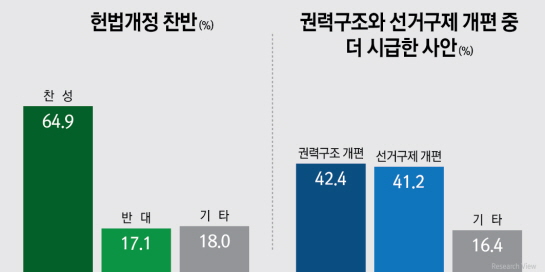 ÃÖ±Ù Á¤Ä¡±Ç ÁÖ¿ä À̽´·Î ¶°¿À¸¥ °³Çå³í¶õ°ú °ü·ÃÇØ 64.9%°¡ °³Çå¿¡ Âù¼ºÇÏ´Â °¡¿îµ¥ ´õ ½Ã±ÞÇÑ »ç¾ÈÀ¸·Î ±Ç·Â±¸Á¶ °³Æí(42.4%)°ú ±¹È¸ÀÇ¿ø ¼±°Å±¸Á¦ °³Æí(41.2%)ÀÌ ÆØÆØÇÑ Á¢Àü¾ç»óÀ» º¸¿´´Ù. ¶ÇÇÑ 67.3%ÀÇ ÀÀ´äÀÚµéÀÌ Çå¹ý Á¦17~18Á¶¿¡ ±ÔÁ¤µÈ ¡°¸ðµç ±¹¹ÎÀº »ç»ýȰ ¹× Åë½ÅÀÇ ºñ¹ÐÀ» Ä§ÇØ¹ÞÁö ¾Æ´ÏÇÑ´Ù¡±´Â Çå¹ýÀû °¡Ä¡°¡ Çö Á¤ºÎ¿¡¼ Àß ÁöÄÑÁöÁö ¾Ê°í ÀÖ´Ù°í Æò°¡Çß´Ù. ![]() - ¹Ú±ÙÇý ´ëÅë·É Á÷¹«Æò°¡ ¡°ÀßÇÔ 38.1%(¡ä6.9) vs À߸øÇÔ 49.3%(¡â4.0)¡± - ±¹¹«ÃѸ® ÀλçÆÄµ¿ Á÷ÈÄÀÎ Áö³ 7¿ùÃÊ(36.1%)¿¡ ÀÌ¾î ¿ª´ë µÎ ¹øÂ°·Î ³·¾Æ Áö³ 7¡¤30 À纸¼± ½Â¸® ÀÌÈÄ 3°³¿ù° »ó½Â¼¼¸¦ À̾´ø ¹Ú±ÙÇý ´ëÅë·É ÁöÁöµµ°¡ ´Ù¼Ò Å« ÆøÀ¸·Î Ç϶ôÇß´Ù. ¡°¹Ú±ÙÇý ´ëÅë·ÉÀÌ ÀÏÀ» ÀßÇϰí ÀÖ´Ù°í »ý°¢ÇÏ´À³Ä, À߸øÇϰí ÀÖ´Ù°í »ý°¢ÇÏ´À³Ä¡±´Â Áú¹®¿¡ ¡®ÀßÇÔ(38.1%) vs À߸øÇÔ(49.3%)¡¯·Î ºÎÁ¤Æò°¡°¡ 11.1%p ´õ ³ô¾Ò´Ù(¹«ÀÀ´ä : 12.6%). 9¿ù¸»°ú ºñ±³ÇØ ±àÁ¤Æò°¡´Â ¡®45.0% ¡æ 38.1%¡¯·Î 6.9%p Ç϶ôÇÑ ¹Ý¸é, ºÎÁ¤Æò°¡´Â ¡®45.3% ¡æ 49.3%¡¯·Î 4.0%p »ó½ÂÇß´Ù. ±àÁ¤Æò°¡´Â 50´ë(ÀßÇÔ 48.5% vs À߸øÇÔ 35.1%), 60´ë(65.5% vs 18.1%), ´ë±¸/°æºÏ(60.0% vs 29.3%)¿¡¼ ³ô¾Ò°í, 19/20´ë(22.7% vs 68.4%), 30´ë(24.3% vs 69.3%), 40´ë(25.8% vs 60.7%), ³²¼º(38.7% vs 51.8%), ¿©¼º(37.6% vs 46.9%), ¼¿ï(39.5% vs 48.7%), °æ±â/ÀÎõ(39.0% vs 49.7%), ÃæÃ»(27.2% vs 63.0%), È£³²(13.1% vs 69.3%), ºÎ»ê/¿ï»ê/°æ³²(42.9% vs 46.0%)¿¡¼´Â ºÎÁ¤Æò°¡°¡ ´õ ³ô¾Ò´Ù. ![]() - Çå¹ý °³Á¤ ¡°Âù¼º(64.9%) vs ¹Ý´ë(17.1%)¡± - ´õ ½Ã±ÞÇÑ »ç¾È ¡°±Ç·Â±¸Á¶ °³Æí(42.4%) vs ±¹È¸ÀÇ¿ø ¼±°ÅÁ¦µµ °³Æí(41.2%)¡± ÆØÆØ ÃÖ±Ù Á¤Ä¡±ÇÀÇ ÁÖ¿ä À̽´·Î ¶°¿À¸¥ Çå¹ý °³Á¤¿¡ ´ëÇØ¼´Â ¼º/¿¬·É/Áö¿ª/Á¤ÆÄ¸¦ ºÒ¹®Çϰí Âù¼ºÀǰßÀÌ ¾ÐµµÀûÀ¸·Î ³ôÀº °ÍÀ¸·Î ³ªÅ¸³µ´Ù. ¡°Áö³ 1987³â äÅÃµÈ Çå¹ýÀ» ½Ã´ë »óȲ¿¡ ¸Â°Ô °³Á¤ÇØ¾ß ÇÑ´Ù´Â °ßÇØ¿¡ ´ëÇØ ¾î¶»°Ô »ý°¢ÇÏ´À³Ä¡±´Â Áú¹®¿¡ ¡®Âù¼º(64.9%) vs ¹Ý´ë(17.1%)¡¯·Î Âù¼ºÀǰßÀÌ 47.8%p ´õ ³ô¾Ò´Ù(¹«ÀÀ´ä : 18.0%). ±×·¯³ª ¡°±Ç·Â±¸Á¶ °³ÆíÀ» À§ÇÑ Çå¹ý °³Á¤°ú ±¹È¸ÀÇ¿ø ¼±°Å±¸Á¦ °³ÆíÀ» À§ÇÑ ¼±°Å¹ý °³Á¤ Áß ¾î¶² »ç¾ÈÀÌ ´õ ½Ã±ÞÇÏ´Ù°í »ý°¢ÇÏ´À³Ä¡±´Â Áú¹®¿¡ ¡®±Ç·Â±¸Á¶ °³Æí(42.4%) vs ¼±°Å±¸Á¦ °³Æí(41.2%)¡¯·Î ÆØÆØÇÑ Á¢Àü¾ç»óÀ» º¸¿´´Ù(¹«ÀÀ´ä : 16.4%). ¿¬·É´ëº°·Î 40´ë ÀÌÇÏ´Â ±Ç·Â±¸Á¶ °³ÆíÀÌ ´õ ½Ã±ÞÇÏ´Ù°í ´äÇÑ ¹Ý¸é, 50~60´ë´Â ±¹È¸ÀÇ¿ø ¼±°Å±¸Á¦ °³ÆíÀÌ ´õ ½Ã±ÞÇÑ »ç¾ÈÀ̶ó°í ÀÀ´äÇß´Ù. Á¤ÆÄº°·Î »õ´©¸®´ç ÁöÁöÃþ(±Ç·Â±¸Á¶ 30.2% vs ¼±°Å±¸Á¦ 51.7%)°ú ¹Ú±ÙÇý ÅõÇ¥Ãþ(±Ç·Â±¸Á¶ 33.0% vs ¼±°Å±¸Á¦ 49.7%) µî ¿©±ÇÃþÀº ±¹È¸ÀÇ¿ø ¼±°Å±¸Á¦ °³ÆíÀ» ´õ Áß½ÃÇÑ ¹Ý¸é, »õÁ¤Ä¡¿¬ÇÕ ÁöÁöÃþ(±Ç·Â±¸Á¶ 59.6% vs ¼±°Å±¸Á¦ 27.3%)°ú ¹®ÀçÀÎ ÅõÇ¥Ãþ(±Ç·Â±¸Á¶ 53.4% vs ¼±°Å±¸Á¦ 31.4%)Àº ±Ç·Â±¸Á¶ °³ÆíÀ» ´õ ²Å¾Æ ¶Ñ·ÇÇÑ Â÷À̸¦ º¸¿´´Ù. - »ç»ýȰ ¹× Åë½Åºñ¹Ð µî Çå¹ýÀû °¡Ä¡ ¡°Àß ÁöÄÑÁü(20.9%) vs ¾È ÁöÄÑÁü(67.3%)¡± - ¹Ú±ÙÇý ÅõÇ¥Ãþ(ÁöÄÑÁü 37.2% vs ¾È ÁöÄÑÁü 46.8%)¿¡¼µµ ºÎÁ¤Æò°¡ ´õ ³ô¾Æ Áö³ 9¿ù °ËÂûÀÌ ¡®»çÀ̹ö ¸í¿¹ÈÑ¼Õ Àü´ã¼ö»çÆÀ¡¯À» ¹ßÁ·Çϰí ÀÎÅÍ³Ý ½Ç½Ã°£ ¸ð´ÏÅ͸µ °èȹÀ» ¹ßÇ¥ÇÑ Á÷ÈÄ »çÀ̹ö ¸Á¸í»çÅ·Πȫ¿ªÀ» Ä¡¸£°í ÀÖ´Â °¡¿îµ¥ ±¹¹ÎµéÀº Çö Á¤ºÎ°¡ ±¹¹ÎµéÀÇ »ç»ýȰ ¹× Åë½Åºñ¹Ð µî Çå¹ýÀû °¡Ä¡¸¦ Àß ÁöŰÁö ¾Ê´Â °ÍÀ¸·Î Æò°¡Çß´Ù. ¡°¸ðµç ±¹¹ÎÀº »ç»ýȰÀÇ ºñ¹Ð°ú ÀÚÀ¯, Åë½ÅÀÇ ºñ¹ÐÀ» Ä§ÇØ¹ÞÁö ¾Æ´ÏÇÑ´Ù°í ±ÔÁ¤ÇÑ Çå¹ýÀû °¡Ä¡°¡ Çö Á¤ºÎ¿¡¼ Àß ÁöÄÑÁö°í ÀÖ´Ù°í º¸´À³Ä, ±×·¸Áö ¾Ê´Ù°í »ý°¢ÇÏ´À³Ä¡±´Â Áú¹®¿¡ 20.9%¸¸ÀÌ ¡®Àß ÁöÄÑÁö°í ÀÖ´Ù¡¯°í ±àÁ¤ Æò°¡ÇÑ ¹Ý¸é, 67.3%´Â ¡®Àß ÁöÄÑÁöÁö ¾Ê°í ÀÖ´Ù¡¯°í ºÎÁ¤ÀûÀÎ Æò°¡¸¦ ³»·È´Ù(¹«ÀÀ´ä : 11.8%). »õ´©¸®´ç ÁöÁöÃþ(Àß ÁöÄÑÁü 44.7% vs ¾È ÁöÄÑÁü 37.9%)À» Á¦¿ÜÇÑ Àü °èÃþ¿¡¼ ºÎÁ¤Æò°¡°¡ ´õ ³ôÀº °¡¿îµ¥ ƯÈ÷ Áö³ ´ë¼± ¹Ú±ÙÇý ÅõÇ¥Ãþ¿¡¼µµ ¡®Àß ÁöÄÑÁü(37.2%) vs ¾È ÁöÄÑÁü(46.8%)¡¯·Î ºÎÁ¤Æò°¡°¡ 9.6%p ´õ ³ô¾Ò´Ù. ÀÌ Á¶»ç´Â ¿©·ÐÁ¶»çÀü¹®±â°ü <¸®¼Ä¡ºä(´ëÇ¥ ¾ÈÀÏ¿ø)>°¡ ÀÎÅͳݹæ¼Û <ÆÑÆ®TV>¿Í ÇÔ²² 10¿ù 30ÀÏ Àü±¹ ¸¸19¼¼ ÀÌ»ó ÈÞ´ëÀüȰ¡ÀÔÀÚ 1õ¸íÀ» ´ë»óÀ¸·Î ÄÄÇ»ÅÍÀÚµ¿ÀÀ´ä½Ã½ºÅÛÀ» ÀÌ¿ë ÀÓÀÇÀüȰɱâ(RDD)·Î ÁøÇàÇß´Ù. Ç¥º»Àº 2014³â 9¿ù¸» ÇöÀç ±¹°¡Áֹεî·ÏÀα¸Åë°è¿¡ µû¶ó ºñ·ÊÇÒ´ç ÈÄ ¹«ÀÛÀ§ ÃßÃâÇß°í, Ç¥º»¿ÀÂ÷´Â 95%½Å·Ú¼öÁØ¿¡ ¡¾3.1%p´Ù. Âü°í·Î º» Á¶»ç ÀÀ´äÀÚ 1õ¸í Áß 47.3%´Â Áö³ ´ë¼±¿¡¼ ¹Ú±ÙÇý Èĺ¸, 38.3%´Â ¹®Àç